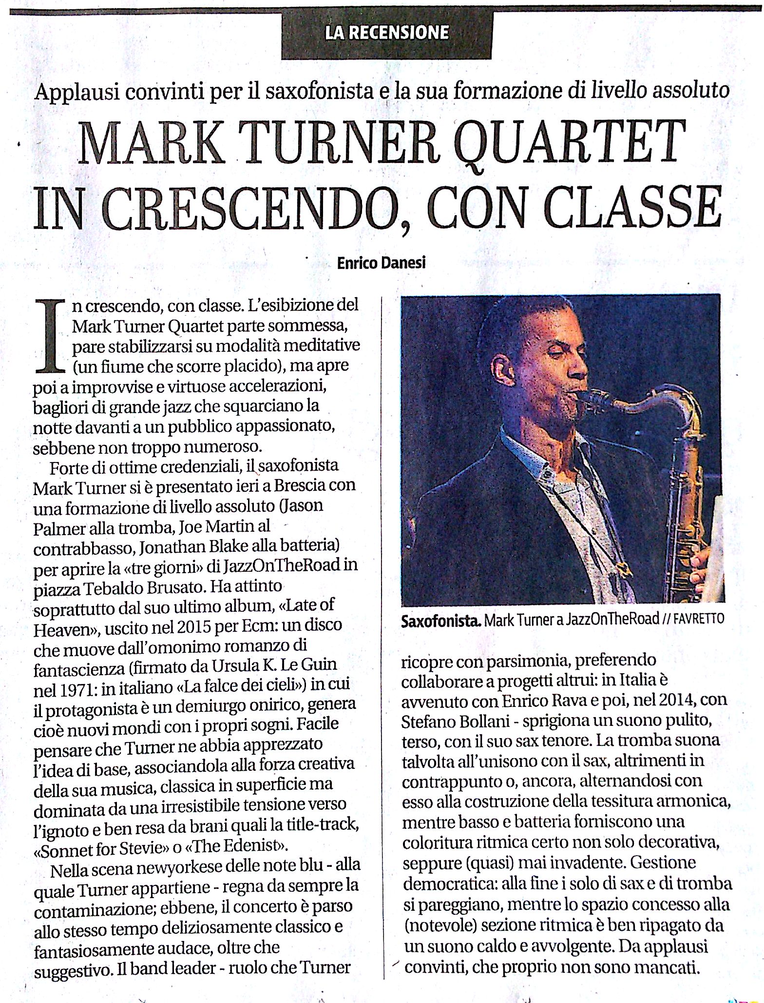 Dal Giornale di Brescia "Applausi convinti per il sassofonista e la sua formazione di livello assoluto - MARK TURNER QUARTET IN CRESCENDO CON CLASSE "
