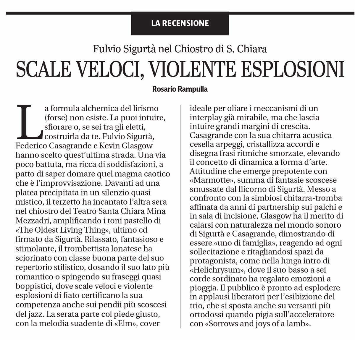 03 July 2016Dal Giornale di Brescia "Mgt Trio, intrigante gioco a sei mani guidato dalle corde di Ralph Towner"
